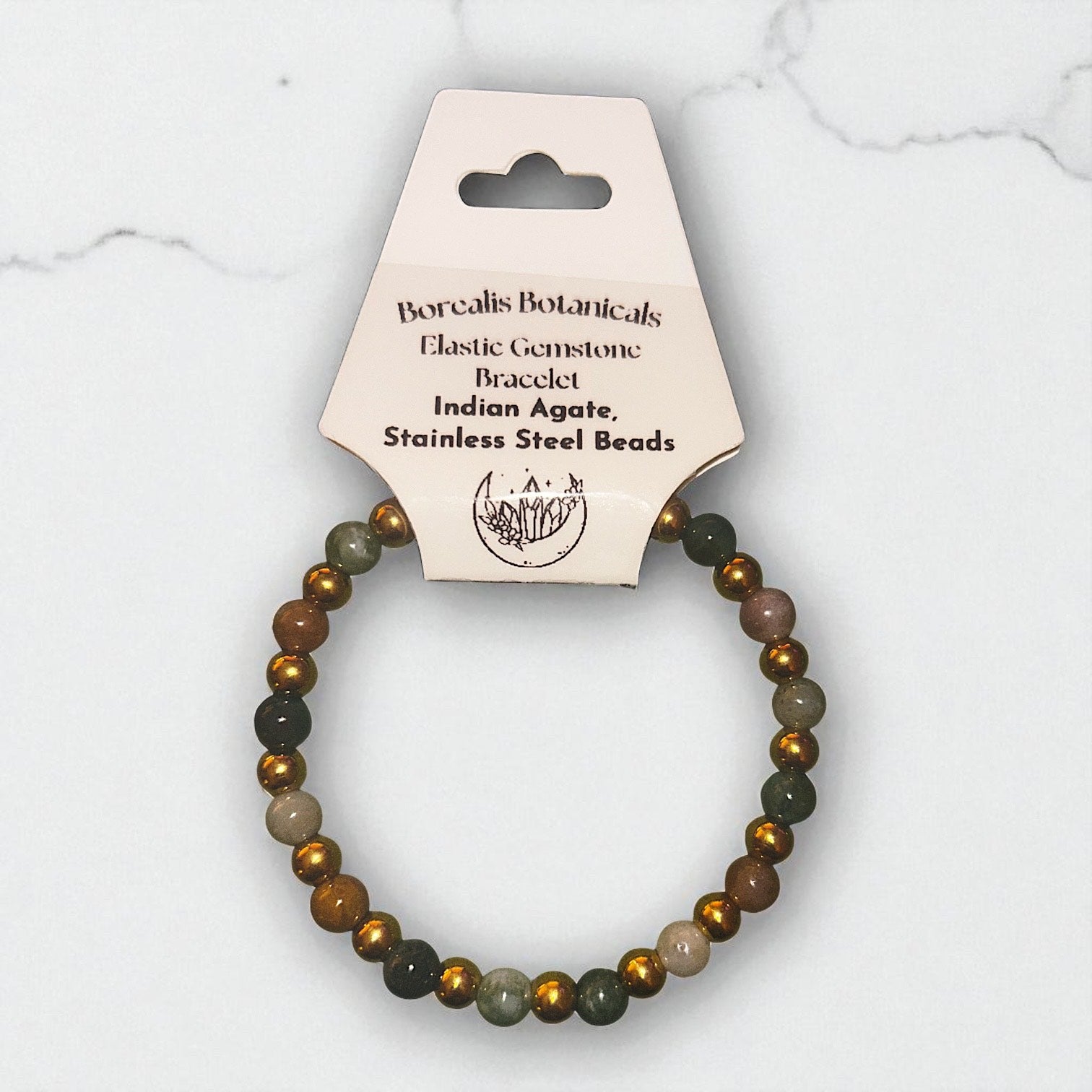 These bracelets are strung on a stretch cord with real gemstones and/or stainless steel beads. Each piece is one-of-a-kind, featuring natural patterns, textures, and colors.